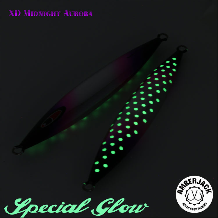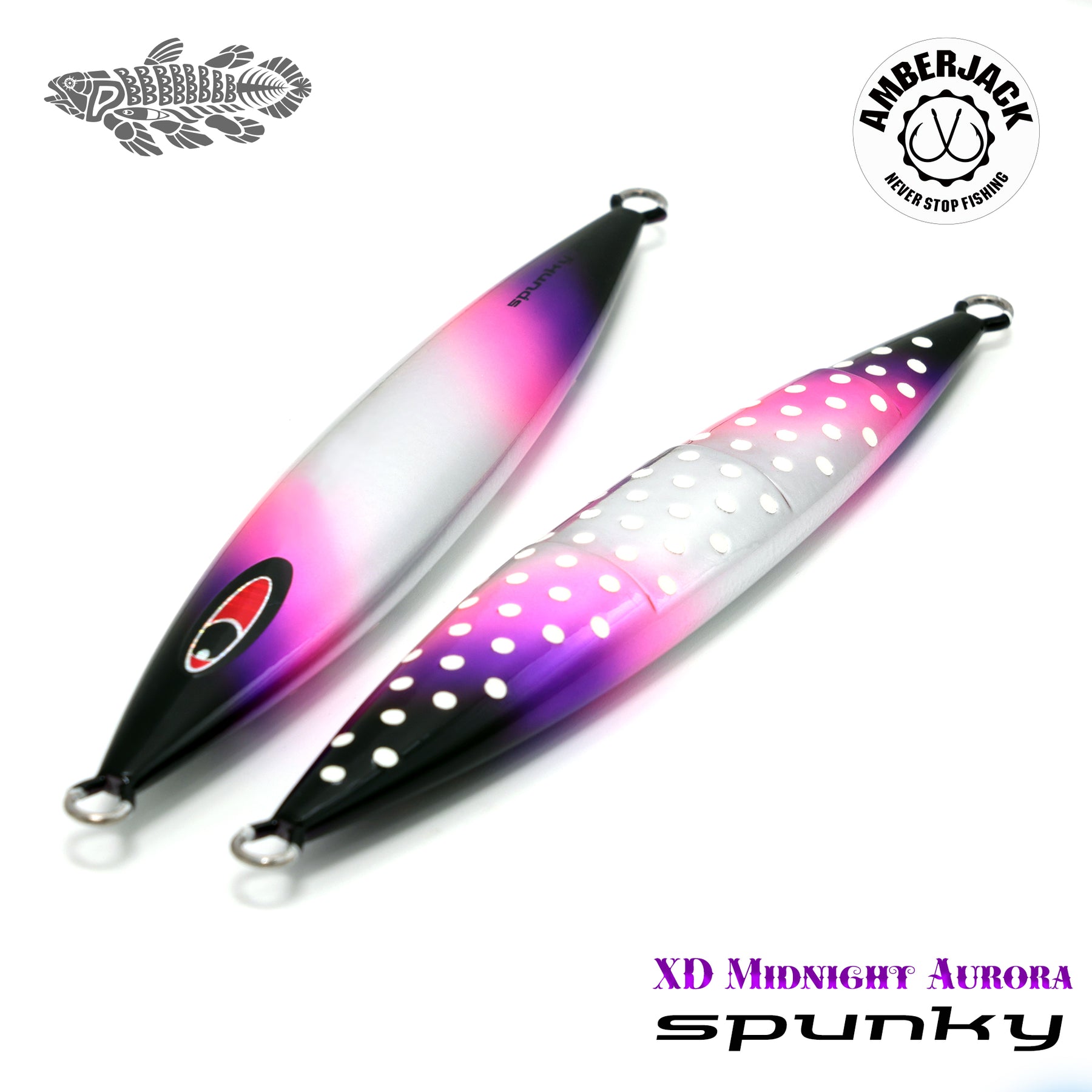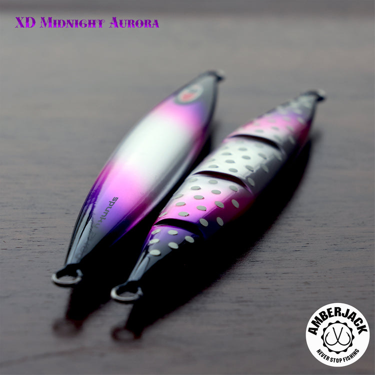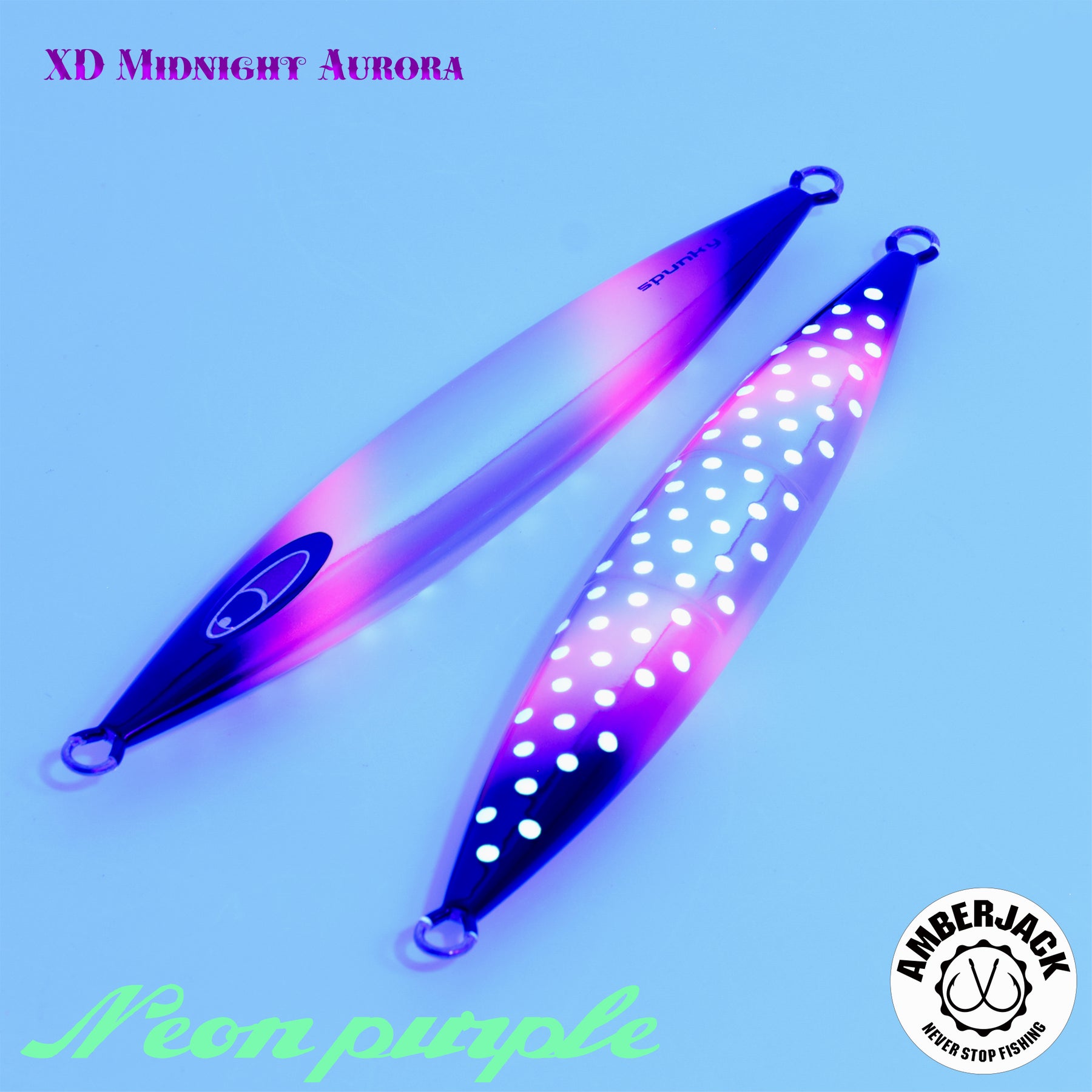 シーフロアコントロールの中でも、特に「上げ」の操作性と高レスポンスなスライド性能を誇る「spunky(スパンキー)」。 アンバージャック限定の別注仕様**「XDミッドナイトオーロラ」は、ベースに採用したアルミホログラムの鈍い輝きに、紫外線に反応して自ら発光する蛍光ピンク**、そして裏面のスペシャルグローを融合。ハイスピードなアクションの中で、ターゲットの視覚を強烈にジャックします。