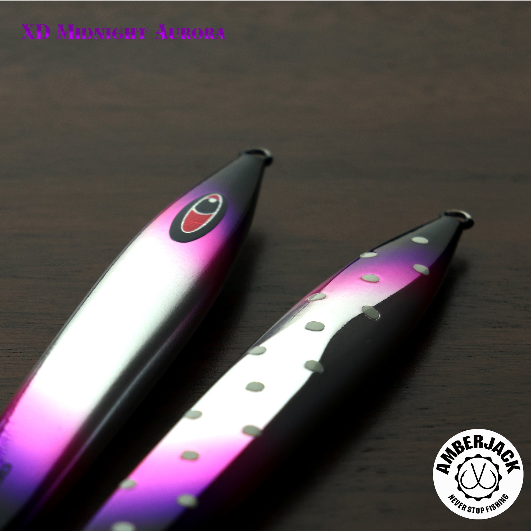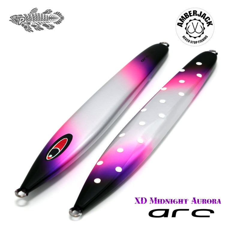 シーフロアコントロールのラインナップの中でも、特に「横方向へのスライド」と「食わせのフォール」に定評のある名作「arc(アーク)」。 アンバージャック限定の別注仕様**「XDミッドナイトオーロラ」は、ベースに採用したアルミホログラムの鈍い輝きに、紫外線に反応して自ら発光する蛍光ピンク**、そして裏面のスペシャルグローを融合。アーク特有のゆったりとしたアクションの中で、多角的な光のレイヤーをターゲットに焼き付けます。