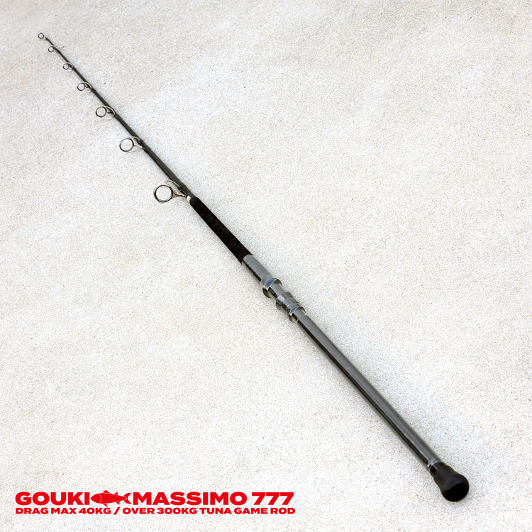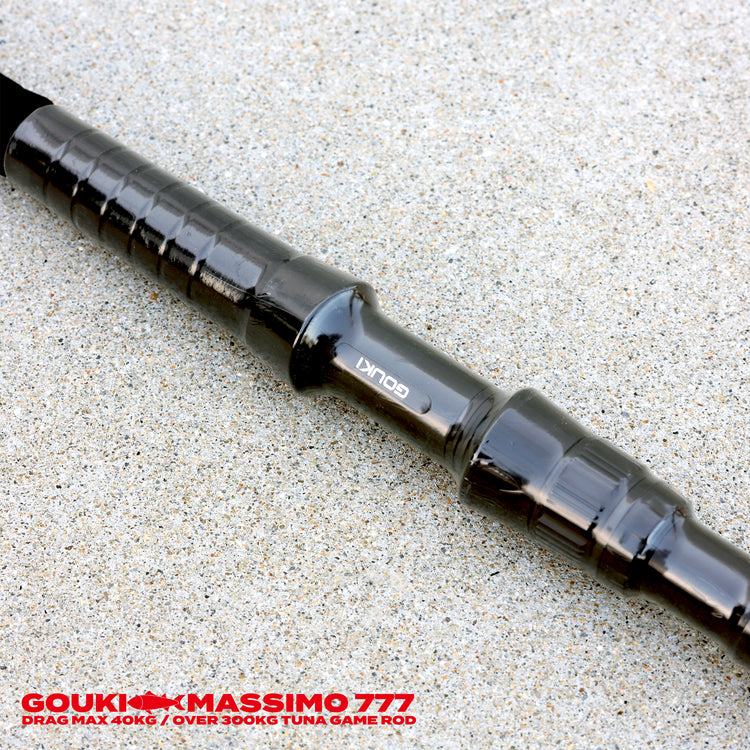 巨大魚と戦うロッドに求められるのは、単純な硬さではありません。伊豆大島周辺で確認される300kgクラスの黒鮪。マックスドラグ40kgの強靭なブランクスは、その圧倒的な突進を受け止め、ラインブレイクを防ぎながら、最終的に魚を浮かせる力へと変換する。剛樹の設計思想は、グラス素材の粘りを最大限に活かした「曲がり」にあります。