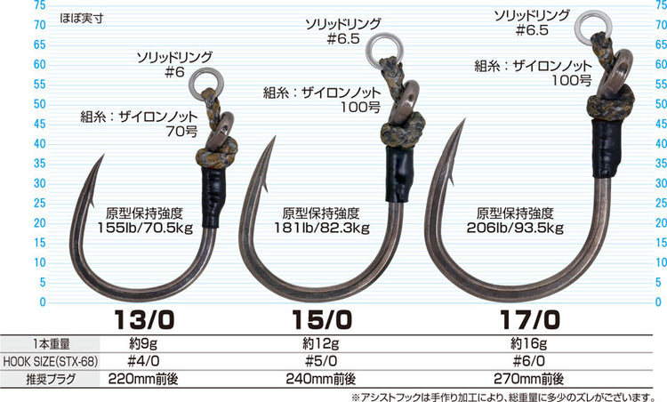 ヒラマサ30kg、マグロ200kg、GT50kgクラスを、「狙って獲りたい」アングラーに贈るアルティメットハイドラグ仕様のシングルアシストフックです。